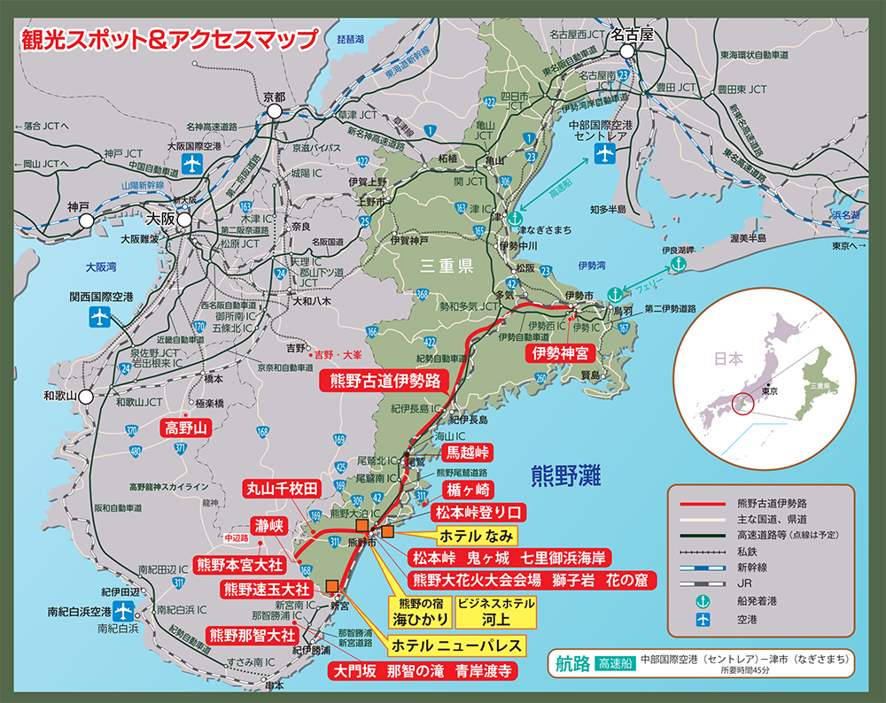 各地 → 中部国際空港セントレア → 津エアポートライン約45分 → 津なぎさまち → 県道約10分 → 津IC → 伊勢道約20分 → 勢和多気JCT → 紀勢道約50分 → 尾鷲北IC → 熊野尾鷲道路約25分 → 熊野大泊IC → 車で約10分